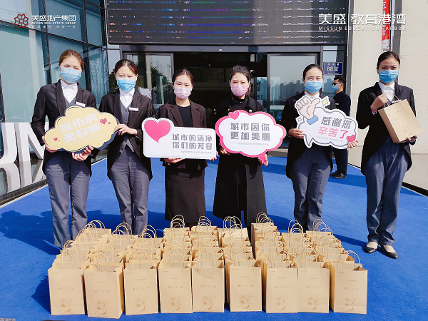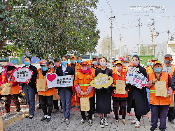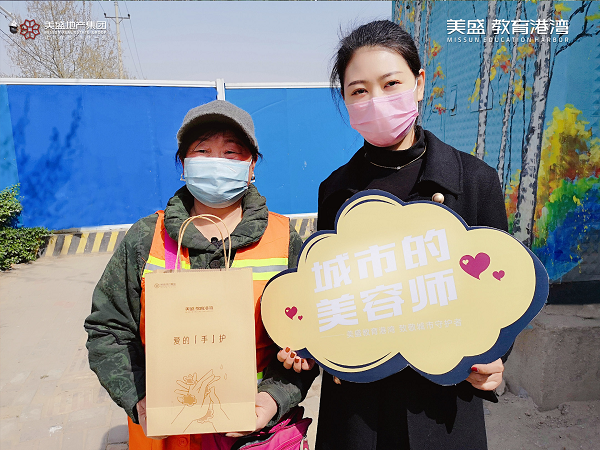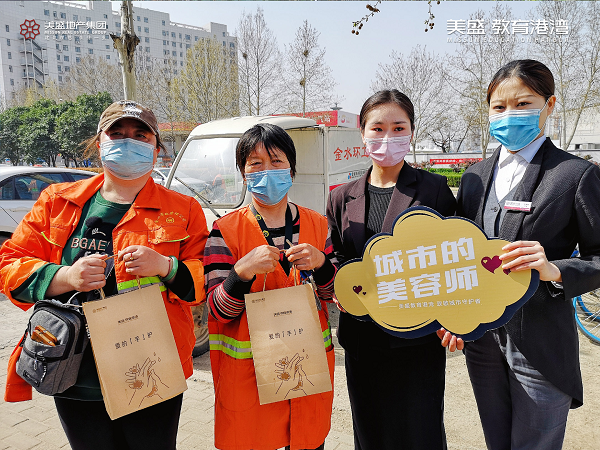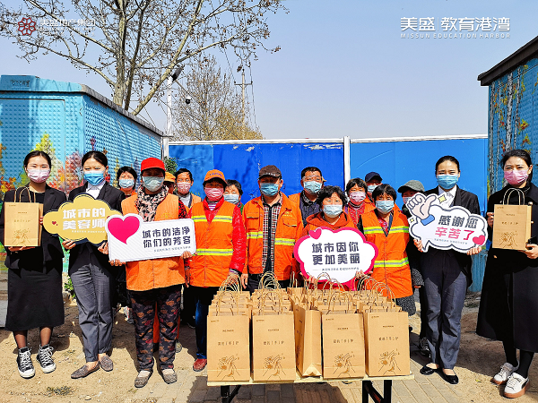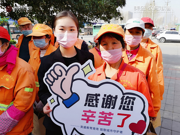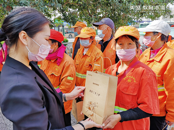 心懷感恩之情,3月20日,美盛教育港灣團隊走到街頭一線,慰問那些堅守崗位一線的環衛工作者,為守護他們的健康送上一份防疫大禮包。