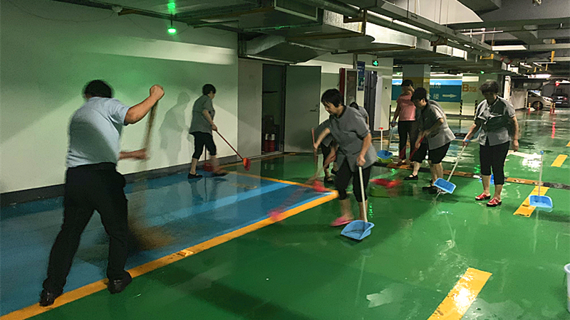在雨水絲毫不減,越下越急的危機時刻,工程部師傅們毅然踏入水中,一點一點清理被堵的排水口,盡全力保障業(yè)主家園安全。平均年齡比其他各部門都高的環(huán)境部工作人員,絲毫沒拖任何后腿,全力向前,爭分奪秒地不間斷補位吸水排污,順利完成美盛中心地下三層車庫無積水出現(xiàn)任務(wù)。