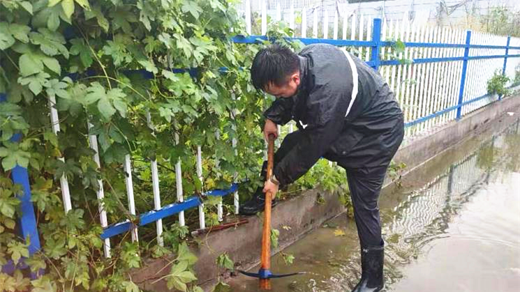 ▲工作人員及時疏通地面、屋面排水溝